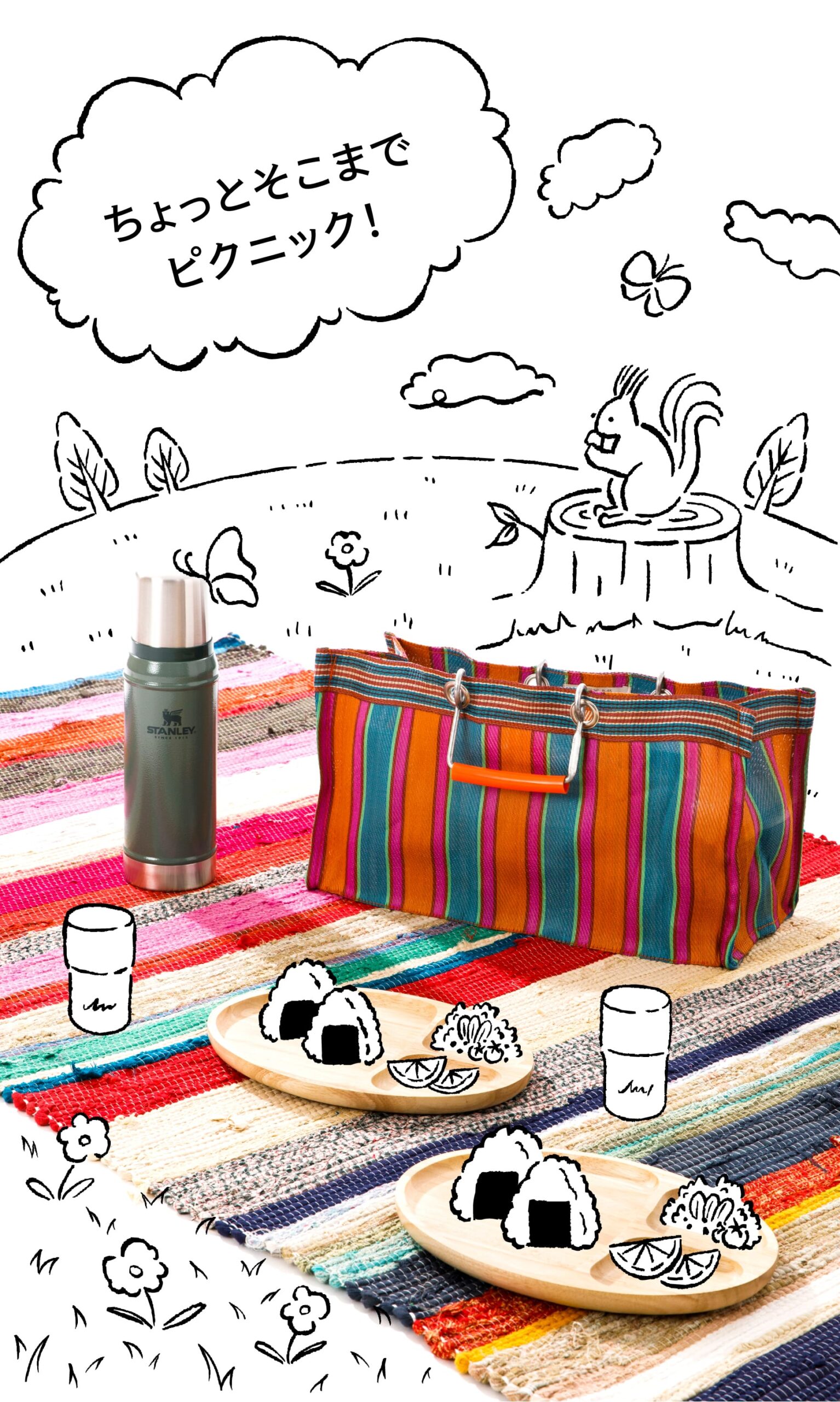 そんなプチピクニックには、使い捨てのレジャーシートやプレートをコンビニで買うのではなく、家からラグやお皿を持っていくと気分もさらに盛り上がりますよ。地球にも優しいエコピクニックです。