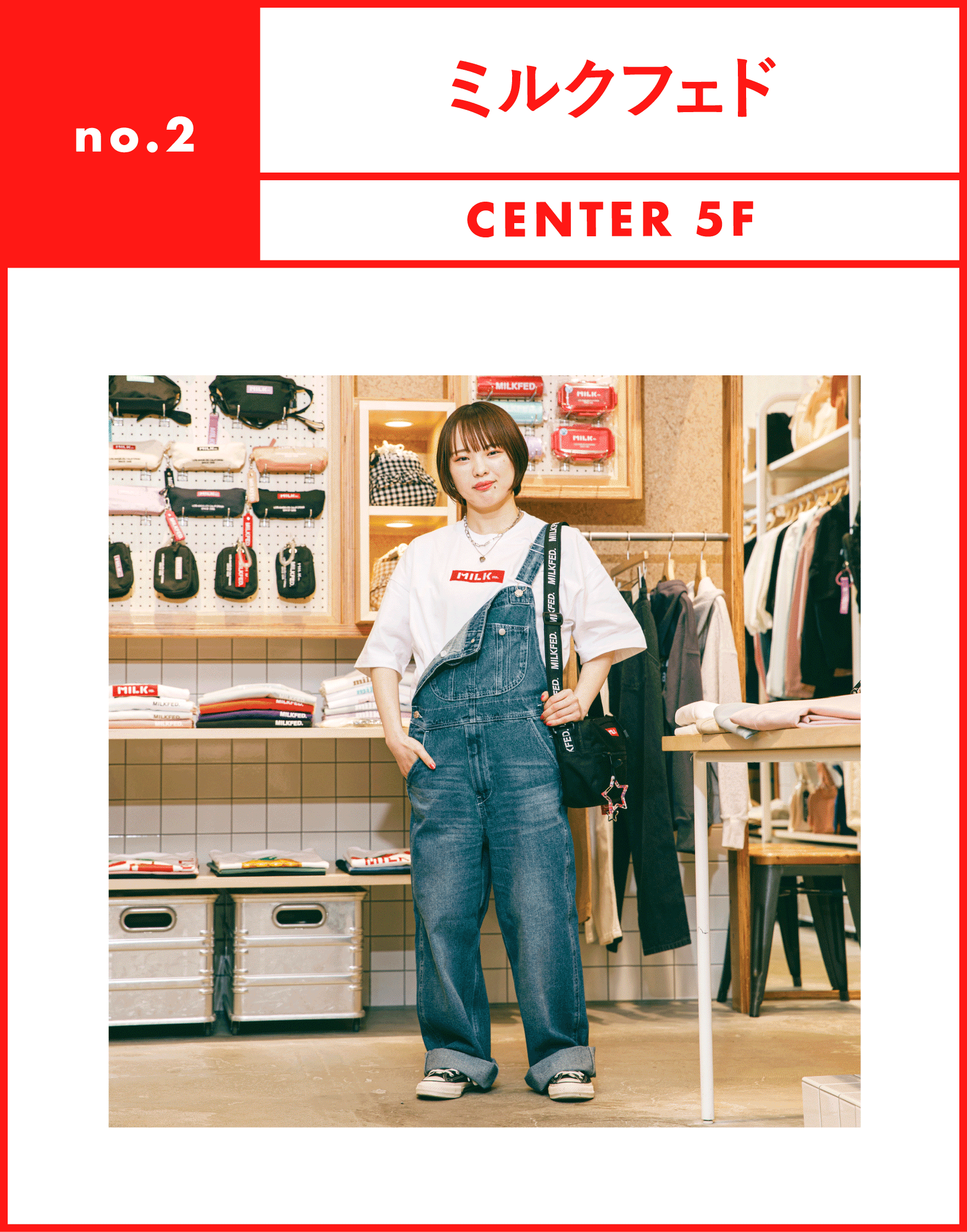定番のブランドロゴが入ったTシャツとショルダーバッグにオーバーオールを合わせたコーデ。毎年出ている定番のTシャツはトレンドに合わせてオーバーサイズのシルエットが人気。「おしゃれしたいけど着方がわからない」という悩みを解決してくれるオーバーオールもミルクフェドの定番。片方のショルダーを外して、Tシャツのバックプリントを見せるのがおすすめの着こなしです!リュックも人気ですが、大きすぎないけどペットボトルが入るサイズのショルダーバッグは、様々な用途に活躍してくれる人気アイテム。