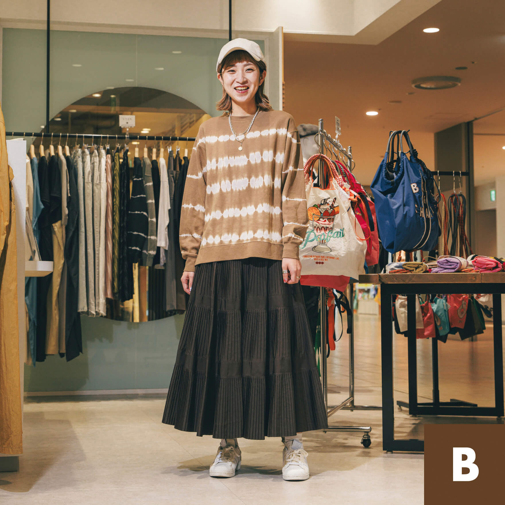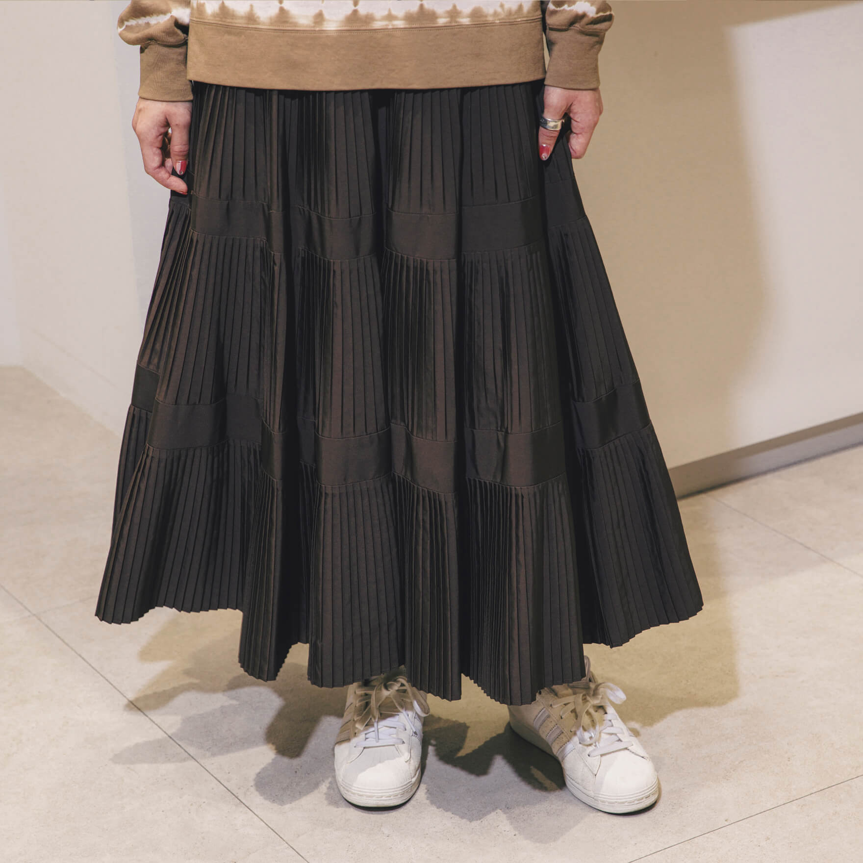 ひかえめな光沢と、動きに合わせて揺れるプリーツが女性らしいティアードスカート。裾に向かってプリーツの面積が広くなり、脚長効果も。「ふだんはAのようなモノトーンコーデが多く、ライブコーデはBの雰囲気。ライブの時は、ファッションでテンションを上げています!」とスタッフの森井さん。