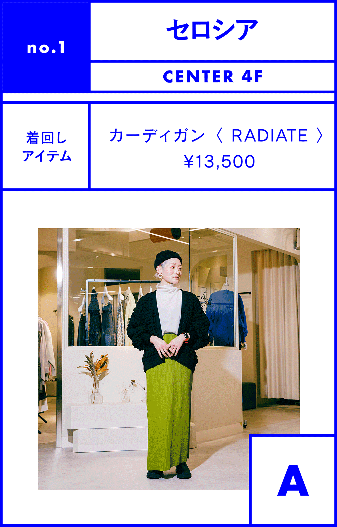 (A)カーディガン 〈 RADIATE 〉 ¥13,500 / タイトスカート 〈 RADIATE 〉 ¥12,000