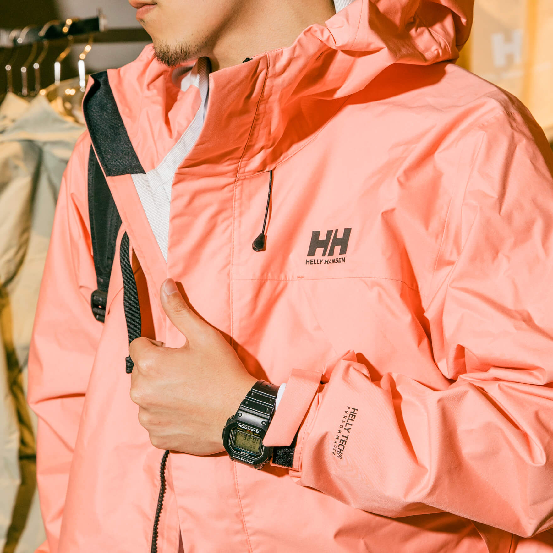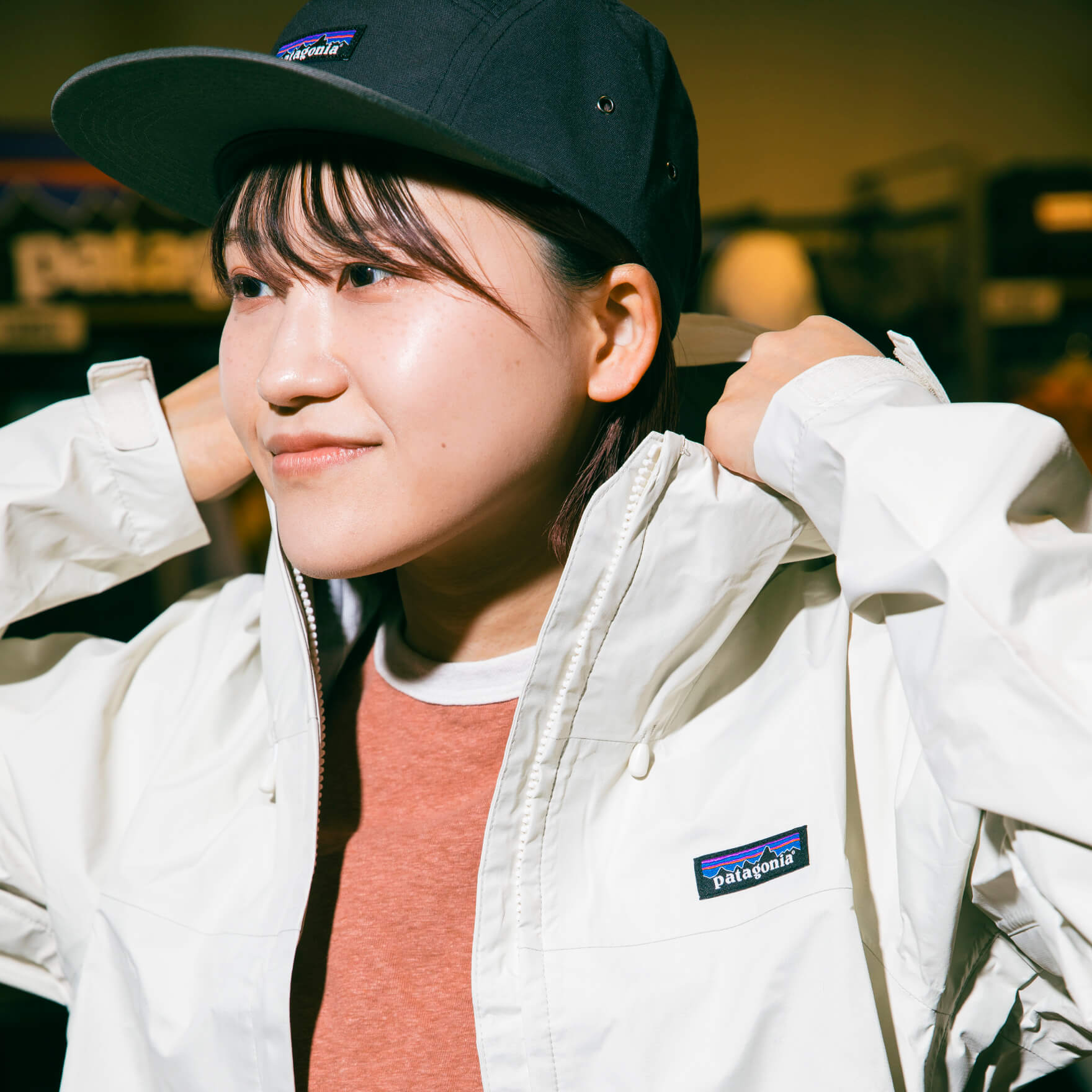 日常使いもできながら、キャンプやピクニック、フェスなどの野外活動にもうってつけ。ベージュのナイロンパーカーに、ライトブルーのハットとスニーカーが青空の下で一層映えそうです。紫外線カットのハットや完全防水のシューズもポイント。「リュックを背負ったままジャケットを着ることもできるんです」と説明してくれたショップスタッフの谷さん。