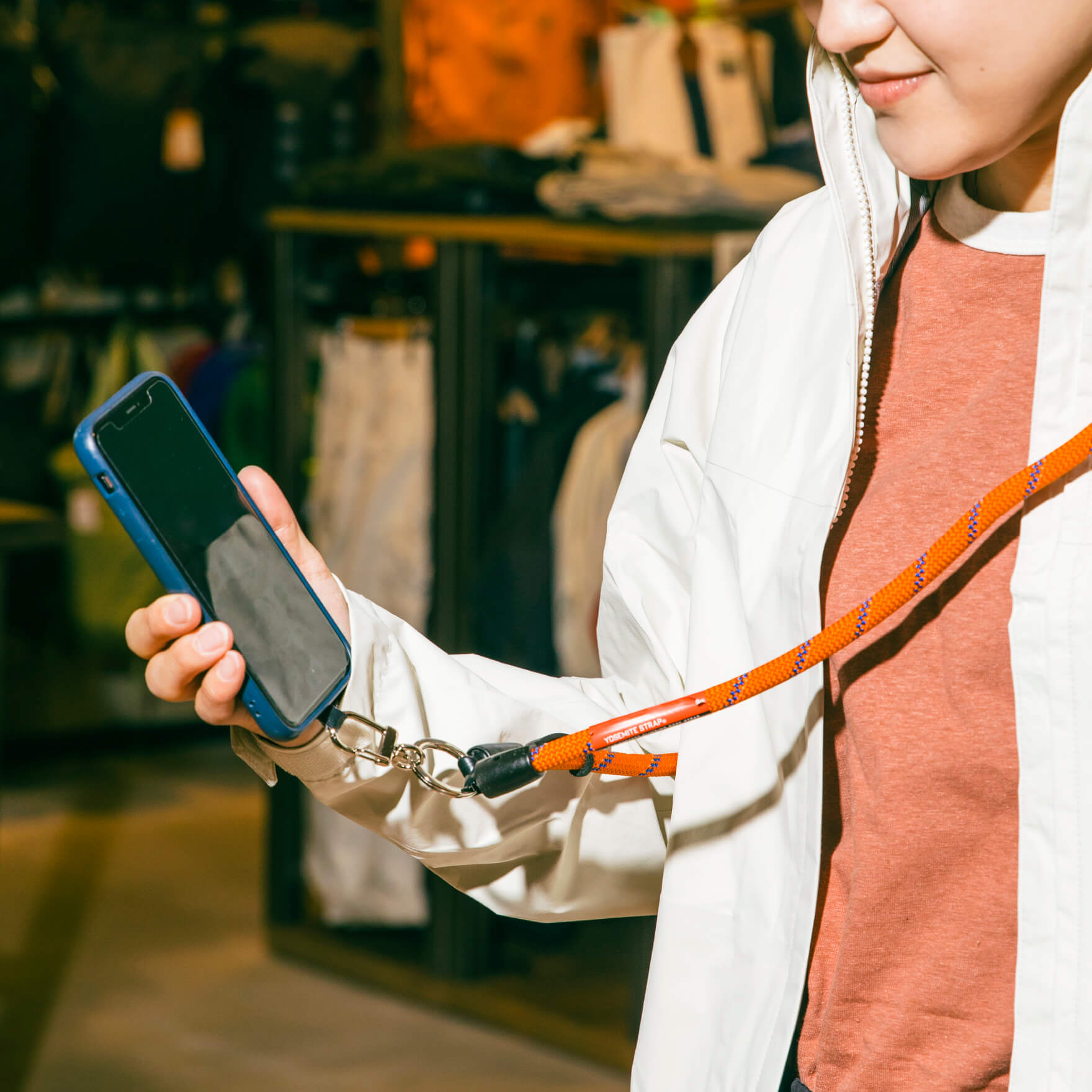 ホワイトとオレンジの明るいカラーで気分も足取りも軽くなりそうなアウトドアスタイル。動きやすいハーフパンツは、野外でのちょっとしたワークアウトにも。足元はクラシカルなヨーロピアンデザインのレザーハイキングシューズでこなれ感を。近くの山に登ってサンドイッチを頬張りたくなっちゃいそうです。男女ともに人気の高いモバイルストラップは、MAMMUTのクライミングロープを使用したというコラボアイテム。